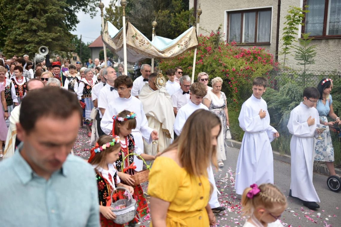 Uroczystość Bożego Ciała została uroczyście przeżyta w naszej parafii. Wierni licznie zgromadzili się na Mszy Świętej sprawowanej przy polowym ołtarzu przez miejscowych duszpasterzy, a następnie wzięli udział w tradycyjnej procesji eucharystycznej do czterech ołtarzy. Dzieci sypały kwiaty przed Najświętszym Sakramentem, a parafianie w strojach ludowych nadali uroczystości szczególnie podniosły i radosny charakter.